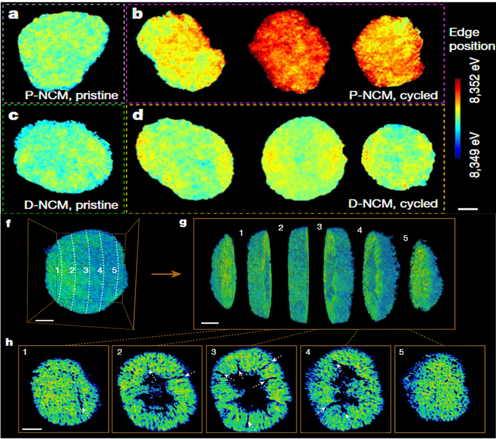 Transmission X-ray microscopy generates images contrasted by the adsorption difference of X-ray from the different components in the materials. A focused X-ray beam is transmitted through the sample and a CCD detector records the transmitted X-ray intensity as a function of the sample position. Such a technique can provide richly detailed information about electrode particles, such as the particle size and homogeneity of the composition. By combining with XANES technique, the color-coded images provide valuable information such as electronic, atomic, and mechanochemical structural changes of electrode particles during the battery operation, and help evaluate the material’s redox stability and reversibility, also predicting the cycling life.