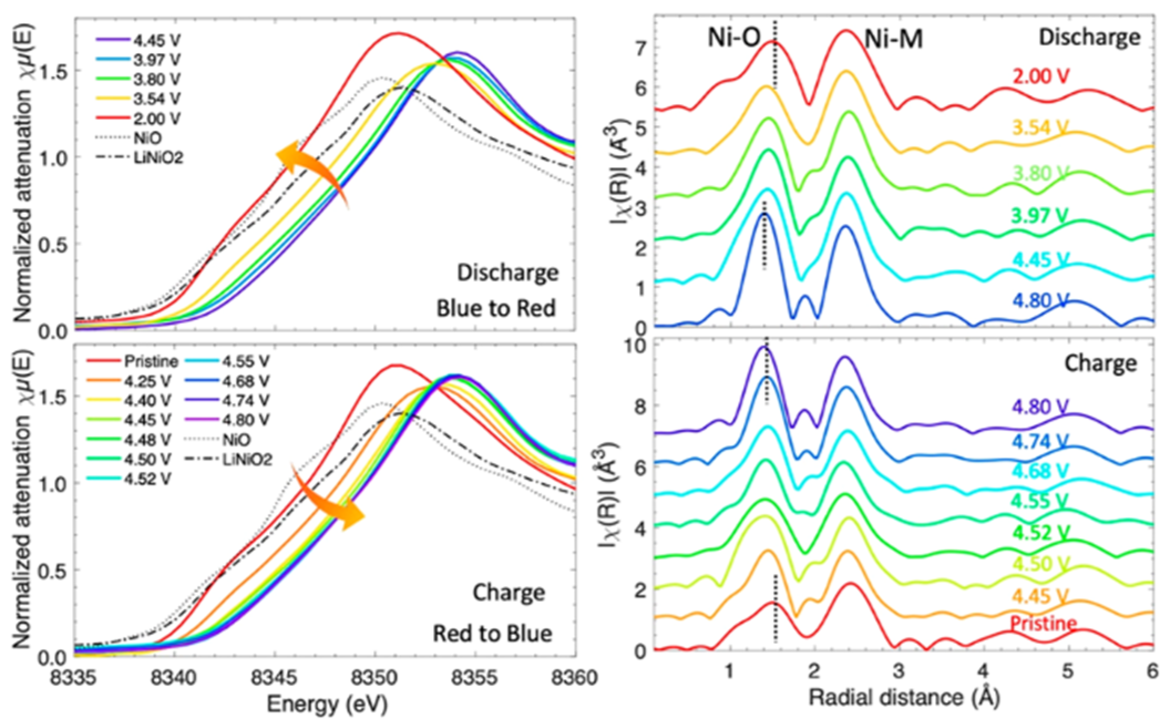 In one of our group’s works, we used such techniques to evaluate the structural reversibility of lithium-rich manganese-based layered oxides, whose high voltage anionic redox and structural distortion mechanism have long been elusive. Via in operando XANES and EXAFS measurements on Ni, we observed perfect reversibility of Ni <-> Ni with no oxidation state change over 4.4 V, indicating that Ni is not an active player both in structural distortion and high voltage capacity.